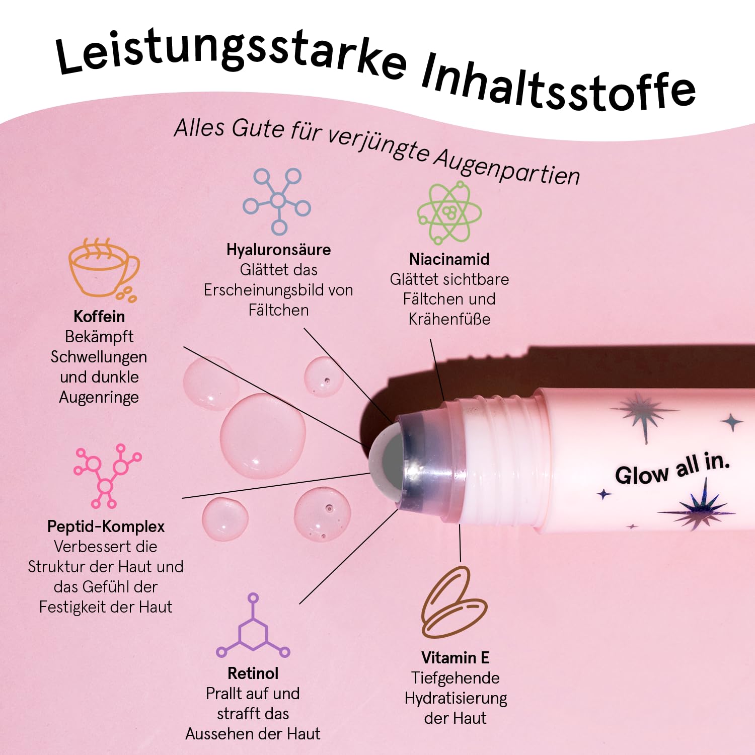Formel: Koffein, Niacinamid und Peptide (gegen Augenringe/Schwellungen); Retinol und Hyaluronsäure (Anti-Aging & intensive Feuchtigkeit).