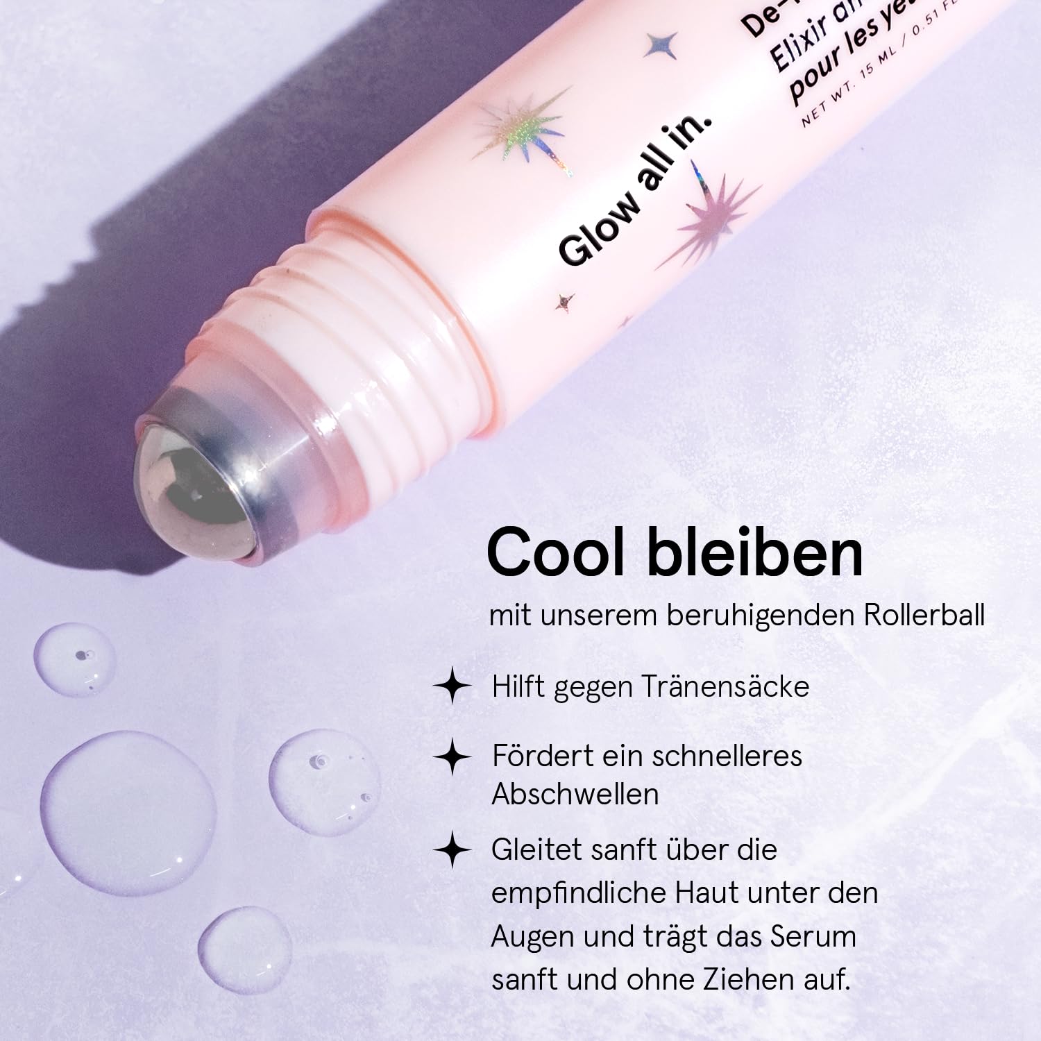 Anwendung/Wirkung: Kühlender Roll-on-Applikator lindert Schwellungen und entspannt die Augenpartie; ideal für den schnellen Frischekick am Morgen oder zur Entspannung am Abend.
